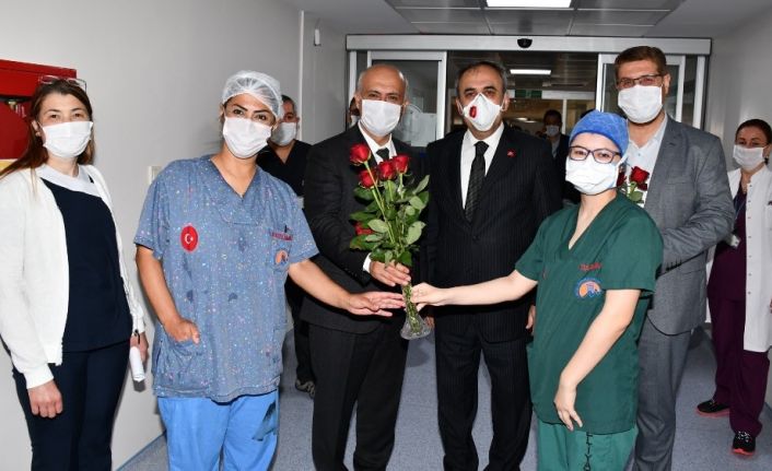 Mersin İl Sağlık Müdürü Sinan Bahçacı, Kovid-19 salgını ile mücadeleyi kararlılıkla sürdüren Mersin Üniversitesi Tıp Fakültesi Hastanesi’ni ziyaret ederek Rektör Prof. Dr. Ahmet Çamsarı ile birlikte sağlık çalışanlarına gül verdi.
