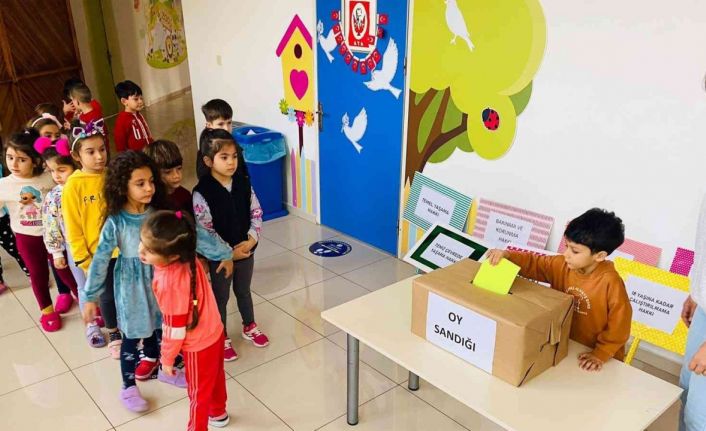 Mezitli Belediyesi bünyesinde hizmet veren Bircan Tüfekçioğlu, Enis-Necip Tüyeni ve Mustafa Baysan Çocuk Gündüz Bakımevinde eğitim alan minikler, demokrasi sınavı verdi.