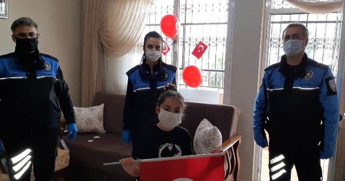 Mersin’de korona virüs salgını dolayısıyla 23 Nisan Ulusal Egemenlik ve Çocuk Bayramı, öğrenciler tarafından bir birinden farklı etkinliklerle evlerinde kutlanırken, polis ekipleri de bazı öğrencilere sürpriz 23 Nisan kutlaması ziyareti gerçekleştirdi.