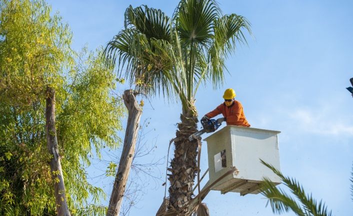 Ekipler kovalı vinç üzerine çıkarak budamayı gerçekleştiriyor. Budama sırasında meydana gelen kalıntılar ise ekipler tarafından temizleniyor. Mersin’in simgelerinden 100 yaşına kadar yaşayabilen ve boyu 30 metreye kadar uzanan palmiyelere özenle bakılıyor.