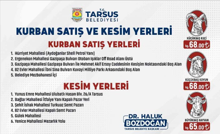 Buna göre Tarsus’taki kurbanlık satış yerleri; Hürriyet Mahallesi (Aydoğanlar Shell Petrol Yanı) Ergenekon Mahallesi Gazipaşa Bulvarı otoban ışıklar Off Road alanı üstü, Gazipaşa Mahallesi Gazipaşa Bulvarı ile Mehmet Akif Ersoy Caddesinin kesişim noktasındaki boş alan, 82 Evler Mahallesi İbni Sina Bulvarı Kuvayı Milliye Parkı arkasındaki boş alan ve Belediye Mezbahanesi içi olarak açıklandı.