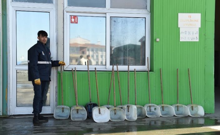 Görevli personel tarafından, bidonlar spiral ile ortadan kesilip sap takılmasıyla birlikte ekstra bir ücret ödemeden faraşa dönüştürülüp temizlik hizmetlerinde kullanılmak üzere ekiplere dağıtılıyor.