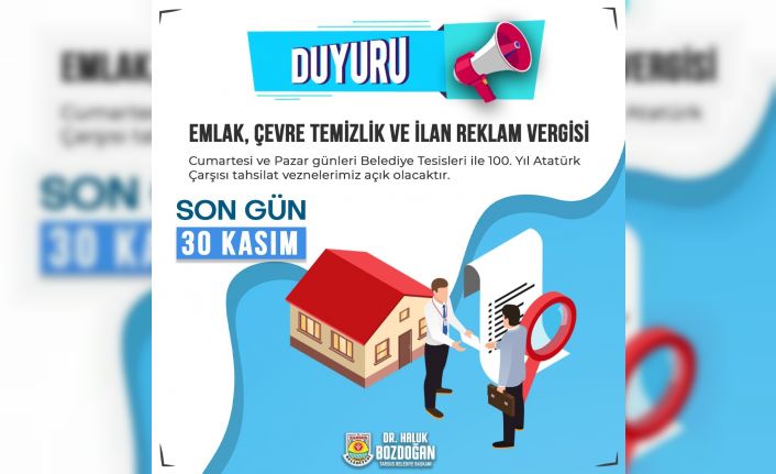 Tarsus Belediye Başkanı Haluk Bozdoğan, 2021 yılı emlak, çevre temizlik, ilan ve reklam vergisinin ikinci taksit ödemeleri ödeme süresinin 30 Kasım 2021 Salı günü mesai saati bitiminde sona ereceğini hatırlatarak, bu hafta sonu da veznelerin açık olacağını söyledi.