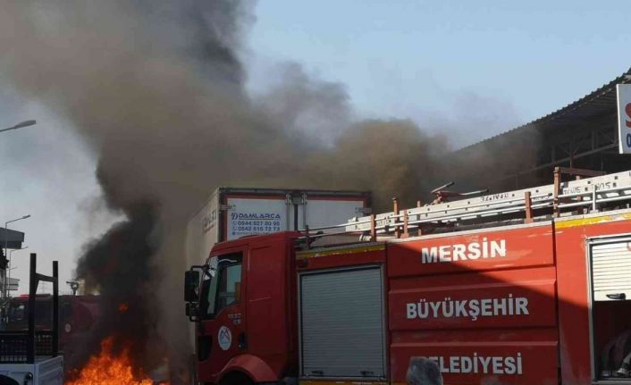 Mersin’in Tarsus ilçesinde sanayi içerisindeki tır alev alev yanarak kullanılmaz hale geldi.
