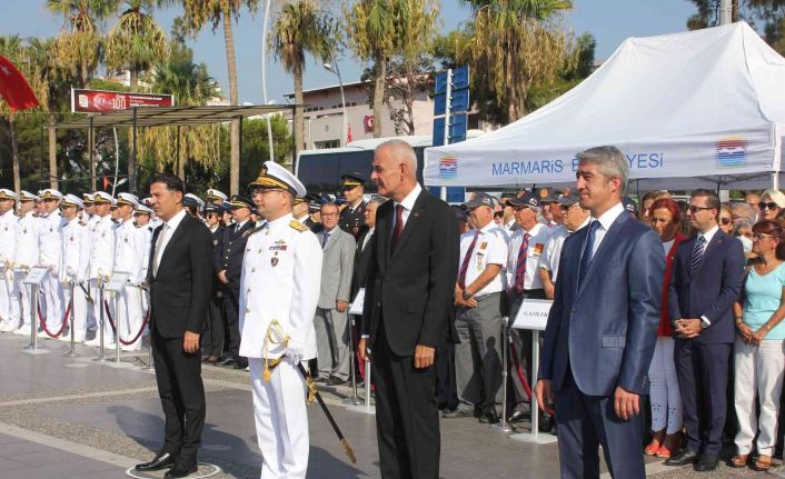 Atatürk Meydanı’nda Atatürk heykeli önünde düzenlenen törene, Marmaris Kaymakamı Ertuğ Şevket Aksoy, Aksaz Deniz Üs Komutanı Tuğamiral İbrahim Kurtuluş Sevinç, Cumhuriyet Başsavcısı Turgay Karabulut, Belediye Başkanı Mehmet Oktay, İlçe Jandarma Komutanı Jandarma Yarbay Murat Çam, İlçe Emniyet Müdürü Oktay Kapsız, siyasi parti temsilcileri, oda ve dernek başkanları, gaziler ile daire müdürleri katıldı. Atatürk heykeline çelenk sunumunun ardından Aksaz Askeri Bandosu eşliğinde saygı duruşunda bulunuldu ve İstiklal Marşı okundu. İlçe Kaymakamı Aksoy, Aksaz Deniz Üs Komutanı Tuğamiral Sevinç, Belediye Başkanı Oktay resmi araç ile tören kortejini selamladıktan sonra tören alanına oturdu. Günün anlam ve önemini belirten konuşmalar yapıldı, Türkiye Cumhuriyeti Cumhurbaşkanı Recep Tayyip Erdoğan’ın 30 Ağustos Zafer Bayramı mesajı okundu, şiirler okundu, folklor gösterileri yapıldı.