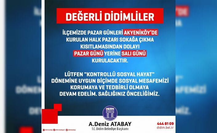 Konu ile ilgili olarak Didim Belediyesi sosyal medya hesapları üzerinden yapmış olduğu paylaşımda, “Değerli Didimliler İlçemizde pazar günleri Akyeniköy’de kurulan halk pazarı sokağa çıkma kısıtlamasından dolayı Pazar günü yerine Salı günü kurulacaktır. Lütfen “kontrollü sosyal hayat” dönemine uygun biçimde sosyal mesafemizi korumaya ve tedbirli olmaya devam edelim. Sağlığını önceliğimiz” açıklamasına yer verdi.