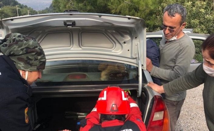Edinilen bilgiye göre, Ölüdeniz Mahallesi Oluklu mevkiinde bir arabanın bagaj kısmındaki köpeğin kafası hoparlör kabinine sıkıştı. Köpeğin kafası sahibinin uğraşmasına rağmen sıkıştığı yerden çıkarılamayınca itfaiyeden yardım istendi. Olay yerine gelen Fethiye İtfaiye Grup Amirliği ekipleri yaptıkları çalışma ile köpeği sıkıştığı yerden kurtardı.