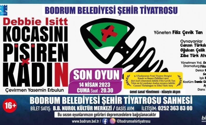 Bodrum Belediyesi Şehir Tiyatrosu’nun üç sezondur oynayan “Kocasını Pişiren Kadın” oyunu, 14 Nisan Cuma Akşamı saat 20.30’da Bodrum Belediyesi Şehir Tiyatrosu Sahnesi’nde, Bodrum seyircisine veda ediyor.