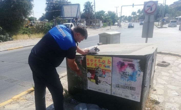 Bodrum Belediyesi Zabıta Müdürlüğü, kamuya açık alanlarda gelişigüzel asılan, çevre ve görüntü kirliliği oluşturan afiş ve ilanlara karşı çalışma başlattı. Belediyeden izin almaksızın asılan afiş, pankart ve ilanlar toplanırken, afişleri asan şahıs ve işletmeler tespit edilerek Kabahatler Kanunu’na göre 320 TL ile 9 Bin 898 TL arasında cezai işlem uygulamaya başlandı. Kent içindeki yönlendirme tabelaları üzerine asılan afişler ise tek tek toplanıyor.