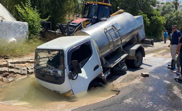 Muğla’nın Bodrum ilçesinde ana isale hattında patlama meydana gelirken, patlağın olduğu noktada tanker çukura düşerek mahsur kaldı.