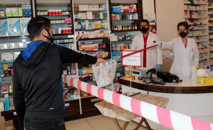 Müşteriler güvenlik şeridinin arkasından ilaçlarını ve para üstünü av filesi sayesinde temas etmeden alıyor.