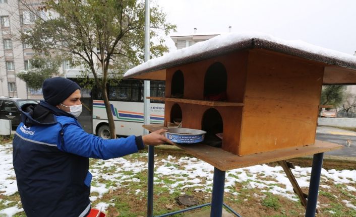 Yoğun kar yağışı nedeniyle sokak hayvanları için harekete geçen Büyükşehir Belediyesi ekipleri, sokakta yaşayan sevimli can dostları için birçok noktada besleme çalışmalarını sürdürdü. Kentin birçok noktasına sokak hayvanları için mama bırakan Büyükşehir ekipleri, onları yalnız bırakmadı.Büyükşehir, kar yağışında can dostlarını unutmadı