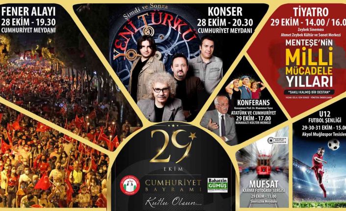 Cumhuriyet Bayramı kutlamaları, 28 Ekim Perşembe günü Cumhuriyet Meydanında Fener Alayı ile başlayacak. Fener alayının ardından açık hava konseri ile ilk gün tamamlanacak. 29 Ekim Cuma günü saat: 14.00’de Zeybek Sineması - Ahmet Zeybek Kültür ve Sanat Merkezi’nde yapılacak ‘Menteşe’nin Milli Mücadele Yılları- Saklı Kalmış Bir Destan’ adlı tiyatro oyunu sahnelenecek. Aynı gün Konakaltı İskender Alper Kültür Merkezi’nde ‘Atatürk ve Cumhuriyet’ konulu bir konferans ve etkinlikler kapsamında MUFSAT Sınırsızlık Meydanında açacağı ‘Karma Fotoğraf Sergisi’ ile fotoğraf severlerle buluşacak.