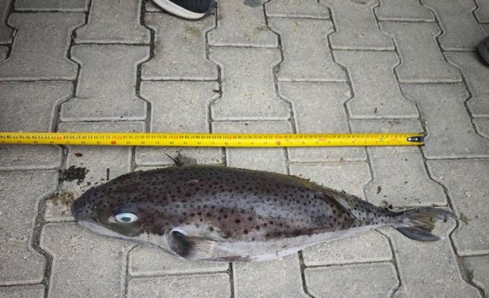 Muğla’nın Datça ilçesi Mesudiye Mahallesi’ndeki Hayıtbükü Sahili’nde temizlik çalışması yapan belediye ekipleri, şiddetli rüzgar nedeniyle kıyıya savrulmuş bir balıkla karşılaştı. Yapılan incelemede, karaya vuran balığın zehirli türlerden biri olan balon balığı olduğu belirlendi. Ekiplerin gerçekleştirdiği ölçümlere göre 68 santimetre uzunluğunda olduğu tespit edilen balon balığının, boyutuyla şimdiye kadar Datça kıyılarında tespit edilen en büyük balon balığı olduğu bildirildi. Tehlikeli türler arasında yer alan ve insanlar için ciddi risk oluşturabilen balon balığı, belediye ekipleri tarafından kontrollü şekilde imha edildi.