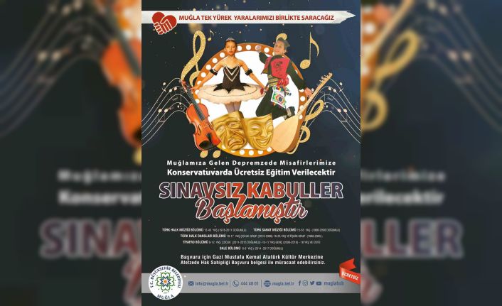 Depremzedelerin sanat eğitimi almaları için konsertavur bölümüne sınavsız alım yapacak olan Muğla Büyükşehir Belediyesi birçok farklı alanda eğitim verecek. Belirlenen kriterler gereği 12-45 yaş arası Türk Halk Müziği, 15-55 yaş arası Türk Sanat Müziği, 10-17 yaş çocuk 18-35 yaş grupları yetişkin Türk Halk Dansları, 8-12 yaş çocuk, 13-17 yaş genç 18 yaş üstü yetişkin Tiyatro Bölümü ve 6-9 yaş bale bölümüne başvurabilecek. Başvurular Gazi Mustafa Kemal Atatürk Kültür Merkezine yapılabilecek. Ayrıca Deprem bölgesinden gelen misafirlerin çamaşır yıkama ve kurutma konusunda da destek sağlayan Büyükşehir Belediyesi Türkan Saylan Çağdaş Yaşam Merkezi içerisinde bu hizmeti de ücretsiz olarak hayata geçirdi.