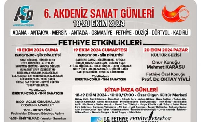 Ses sanatçısı Eser Tunçoğlu, birbirinden güzel türküleriyle festivale renk katacak. Özbekistan Harezm şehrinden yazar Muhabbat Safa, yeni çıkardığı Türkçe kitabını ilk kez Fethiye’ de görecek ve yine ilk kez Fethiyeli okurlara imzalayacak. Kendi lehçesinden şiirler okuyacak. 6.Akdeniz Sanat Günleri Fethiye etkinlikleri 18 Ekim Cuma günü Festival tertip komitesi Başkanı Coşkun Karabulut’un açılış konuşması ile başlayacak. İlk gün kitap imza etkinlikleri ve türküler ile devam edecek. Prof. Dr. Oktay Yivli, ‘Fethiye’den Dünyaya Edebiyat Açılımı’, Ümit Yılmaz, ‘Yaraları Sararken’, Sami Gökmen, ‘Türkçemiz ve Ortak Alfabeye Doğru’ konularında konuşmalar yapacak. İkinci gün ise kitap imza etkinlikleri, şiir ve türkülerle tamamlanacak. Festival, kültür gezisi ile sanat günleri ile sona erecek.