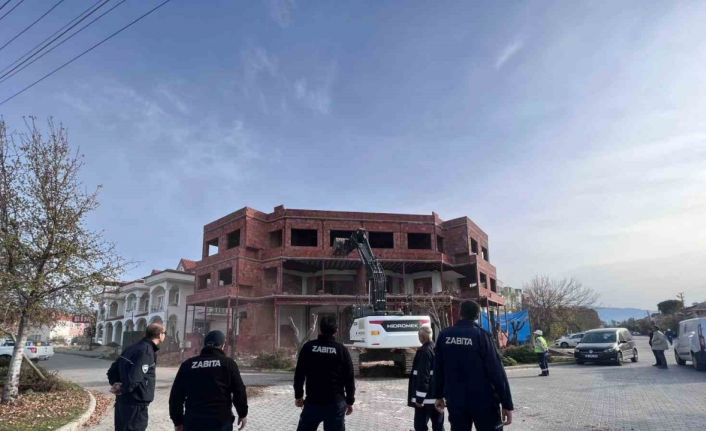 Fethiye’nin Foça Mahallesi’nde imara aykırı olarak yapılan binalar belediye ekipleri tarafından defalarca uyarılmasına rağmen inşaat sahipleri tarafından kaçak olan bölümler yıkılmayınca ekipler harekete geçti. Ş.B.’ye ait olduğu öğrenilen binanın ilave kısımları ve çekme mesafesine yapıldığı iddia edilen bölümlerin kaçak olması nedeniyle binada yıkım çalışması yapıldı.