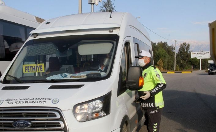 İçişleri Bakanlığı tarafından 81 ilin valiliklerine gönderilen talimat doğrultusunda, Fethiye’de toplu taşıma araçları ve taksilerde Korona virüs denetimi yapıldı. Denetim noktasında resmi ekipler sürücülerin evrak kontrolü yapılırken, yolcuların da HES kodlarını, maske, sosyal mesafe hijyen kurallarına uyulup uyulmadıklarını kontrol etti.