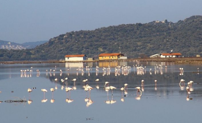Bodrum-Milas karayolunda bulunan Tuzla sulak alanına gelen binlerce flamingo, kış ortasında güneşli havanın keyfini çıkardı. Doğal güzellikleriyle görenleri kendilerine hayran bırakan flamingolar, bir yandan sulak alanda avlanıp diğer yandan da bölgede kışlıyor.