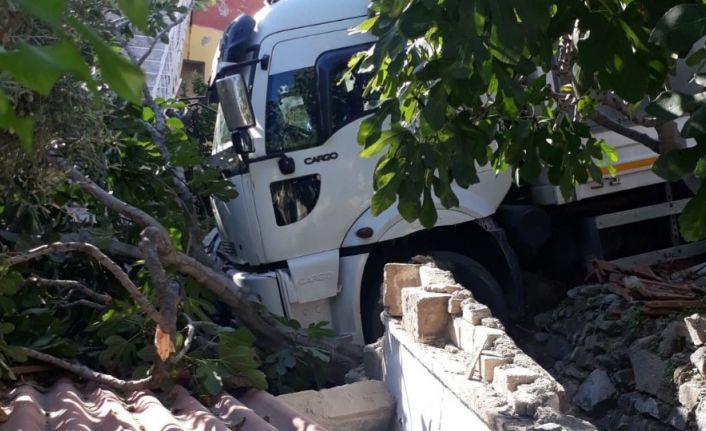 Muğla’nın Milas ilçesinde nakliye işlerinde kullanılan park halindeki bir kamyon freninin boşalması üzerine önce bir otomobili altına aldı, daha sonra ise bir evin bahçesine uçtu.