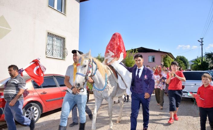 Muğla’nın Fethiye ilçesinde bir damat, gelin alma etkinliğini gelini ata bindirerek gerçekleştirdi.