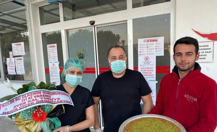 Sağlık çalışanlarına destek için 75. Yıl Milas Devlet Hastanesini ziyaret eden genç işletmeciler, künefe ve çiçek hediye ederek destek mesajı verdi.