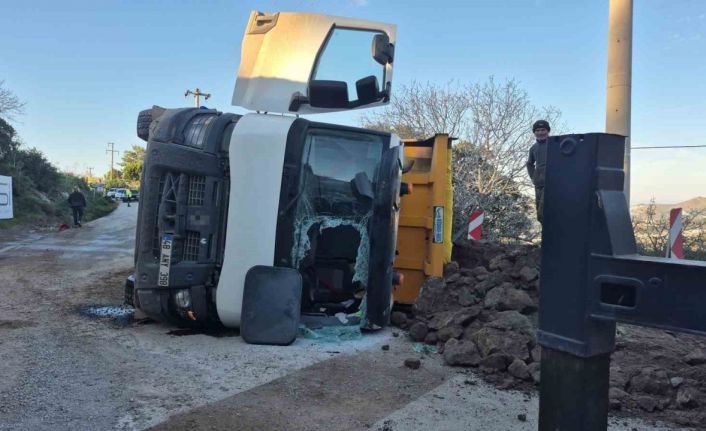 Muğla’nın Bodrum ilçesinde yol kenarındaki çukura giren hafriyat kamyonu devrilirken, yolun trafiğe kapandığı kazada 1 kişi yaralandı.