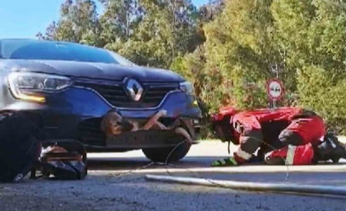 Fethiye itfaiye grup amirliği ekipleri tarafından ön tampona sıkışan köpek sıkıştığı yerden kurtarılmasının ardından doğal yaşam alanına döndü. Tampona sıkışan köpeğin sağlık durumunun iyi olduğu öğrenildi.