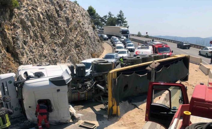 Muğla’da öğle saatlerinde Ula Sakartepe rampasında meydana gelen kum yüklü tırın yolu kapatmasının ardından uzun süre kapalı kalan karayolu tek şeritten trafiğe açıldı.