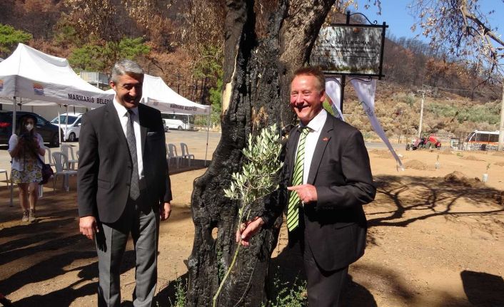 Marmaris Belediye Başkanı Mehmet Oktay ve Fürth Belediye Başkanı Thomas Jung birlikte yanmış bir zeytin ağacının kalan gövdesinin gölgesine yine bir zeytin ağacı diktiler. Ağacı dikerken bu dostluğumuz adına çok bir sembol şeklinde konuştu.