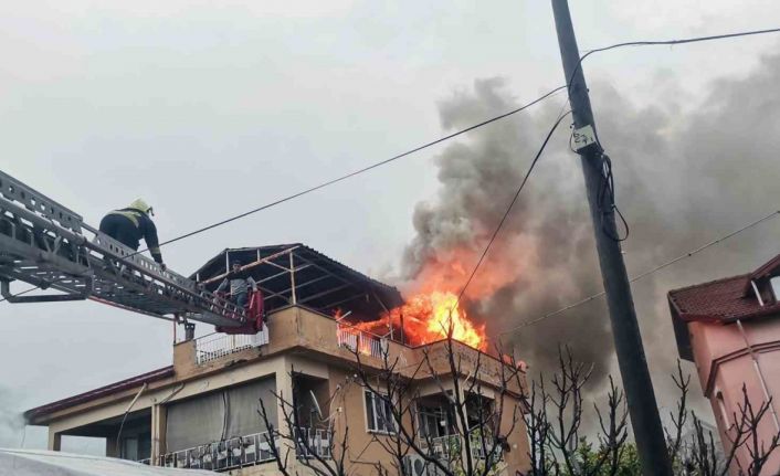 Yangın esnasında konutta mahsur kalan vatandaş kurtarılarak acil sağlık ekiplerine teslim edilirken, binanın çatısı, evin tüm odaları ve eşyaları tamamen yanarak zarar gördü.