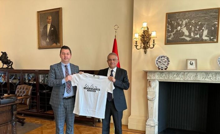 Başkan Ayyıldız, tanıtım programı dahilinde İngiltere’nin Londra şehrinde bulunan Türkiye’nin Londra büyükelçisi Ümit Yalçın’ı makamında ziyaret ederek, 2022 turizm sezonu ile ilgili durum değerlendirmesi yaptıklarını belirtti. 2022 yılında Türkiye ye yaklaşık 3.5 milyon İngiliz turist geldiğini 2023 yılında ise hedefin 5 milyon İngiliz turist sayısına ulaşmak olduğunu anlatan Ayyıldız büyükelçimize ‘Let’s go to Marmaris this summer ‘(haydi bu yaz Marmaris’e gidelim) baskılı tişört hediye etti.