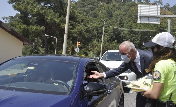 Marmaris Kaymakamı Ertuğ Şevket Aksoy’unda katıldığı uygulamada Marmaris İlçe Emniyet Müdürlüğü Trafik tescil Şube Amirliği ekipleri, Trafik Haftası kapsamında sokağa çıkma kısıtlamasından muaf tutulan ve görevli olan sürücülerin ile beraberindeki yolcuları trafik kurallarını hatırlatarak kurallara uymaları konusunda uyarılarda bulundu.
