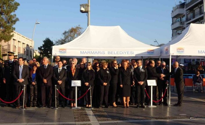 Marmaris Atatürk Meydanı’nda saat 08.45 te başlayan törende Marmaris Kaymakamı Ertuğ Şevket Aksoy, Aksaz Deniz Üs Komutanı Tuğamiral İbrahim Kurtuluş Sevinç ve Marmaris Belediye Başkanı Mehmet Oktay çelenk Atatürk Büstüne çelenk sundu. Marmaris Cumhuriyet Başsavcısı Turgay Karabulut, Askeri erkan, Emniyet birimleri, Gaziler ve şehit yakınları, Belediye Başkan yardımcıları, siyasi parti ilçe temsilcileri, sosyal toplum kuruluşları, ilçe protokolü ve okulların da hazır bulunduğu anma töreni, sirenlerin ardından Aksaz Deniz Üs Komutanlığı bandosu eşliğinde önce 2 dakikalık saygı duruşu sonrasında İstiklal Marşı okunması ile sona erdi.
