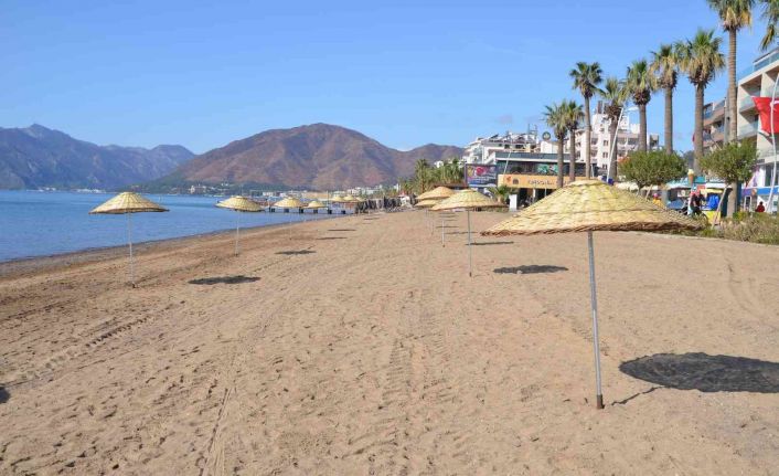 Muğla’nın Marmaris ilçesinde ilk olarak 2019 yılında hayata geçirilen halk plajlarındaki ücretsiz şemsiyeler deniz sezonu hazırlıkları çerçevesinde plajdaki yerlerini aldı.
