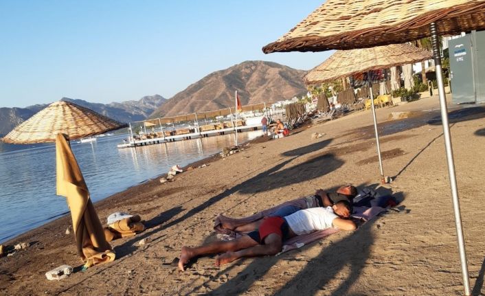 Gözde turizm kenti Muğla’nın Marmaris ilçesinde sabah 07.00 da bir Marmaris yaşayanının çektiği fotoğrafta Halk plajındaki şemsiyelerin altında onlarca kişinin konakladığı görülüyor.