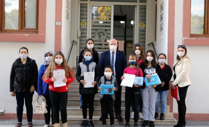 Menteşe Belediye Başkanı Bahattin Gümüş, Covid-19 pandemisi nedeniyle eğitimlerine evlerinden devam etmek zorunda kalan öğrencilere başkanlık binası önünde tabletlerini teslim etti.