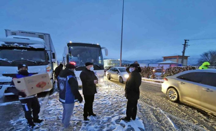Muğla-Denizli karayolu döner kavşakta yoğun kar yağışı nedeniyle yolların kapanmasıyla mahsur kalan sürücülere ve yolculara Muğla simidi dağıtan Başkan Gümüş; “Olumsuz hava koşulları nedeniyle bazı yollar trafiğe kapatıldı, bunun dışında trafikte çok sayıda araç mahsur kaldı. Sabahın ilk saatlerinde Denizli- Muğla karayolu döner kavşakta mahsur kalan sürücülere ve yolculara Muğla Simidi dağıttık. Vatandaşlarımızdan bu süreçte dikkatli olmalarını, hava şartlarının kötüleşmesi durumda gerekli olmadıkça dışarı çıkmamalarını, trafiğe çıkacak vatandaşlarımızın zincir ve çekme halatı gibi gerekli ekipmanları takmalarını tavsiye ediyoruz. Hava şartları nedeniyle olumsuzluk yaşayan vatandaşlarımız belediyemizin çağrı merkezini arayabilir, 0 (552) 214 48 80 numaralı WhatsApp ihbar hattına mesaj atabilirler. Ekiplerimiz karla mücadele çalışmalarına gün içinde aralıksız devam edecekler" dedi.