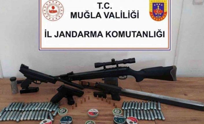 Yapılan aramada, Glock marka tabanca, şarjör, 12 adet 9 mm fişek, bir adet havalı tüfek, 2 adet havalı tabanca, tüfek dürbünü, kılıç, 57 adet hava tüpü ve çok sayıda havalı silahlara ait mermi ele geçirildi.