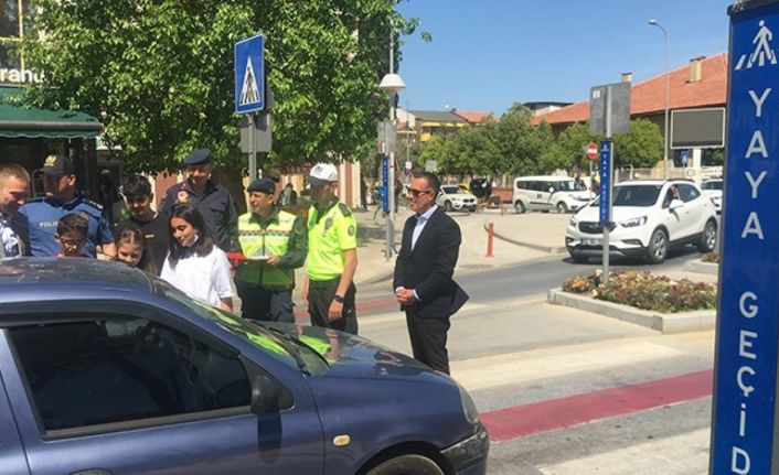 Kaymakam Böke sürücülere uyarılarda bulunup kısa süreli sohbet ederken, öğrenciler ise araçta bulunan çocuklara düdük hediye ederek, içerisinde bulundukları araçların sürücülerinin hata yapması durumunda düdüğü çalarak uyarıda bulunmalarını istediler.
