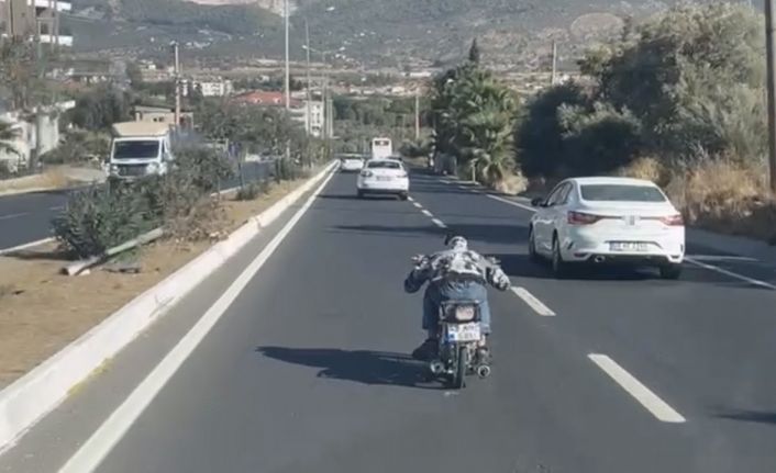 Muğla’nın Milas ilçesinde kask takmadığı görülen bir motosiklet sürücüsünün trafikteki tehlikeli sürüşü, cep telefonu kamerasına yansıdı.