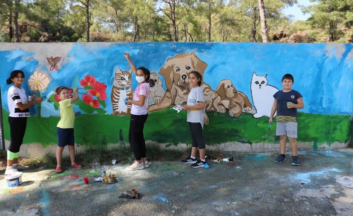Minik ressamlar, Marmaris Belediyesi Geçici Hayvan Bakımevi’nin duvarlarını kedi, köpek, çiçek gibi figürler çizerek rengarenk boyadı.