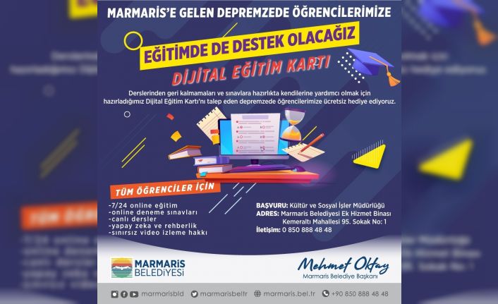 Marmaris Belediyesi deprem nedeniyle ilçeye gelen misafir öğrencilerin eğitimine de katkı sağlayacak. İsteyen öğrencilere binlerce online içeriğe sahip dijital eğitim kartı hediye edilecek.