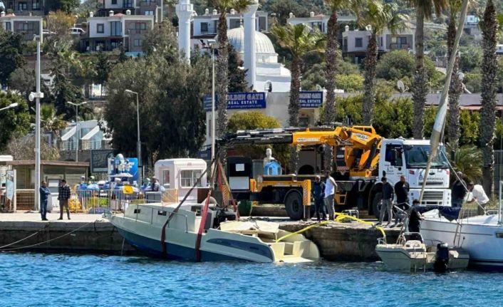 Muğla’nın Bodrum ilçesinde dün etkili olan fırtınada batan bir motoryat, vinç yardımıyla kurtarıldı.