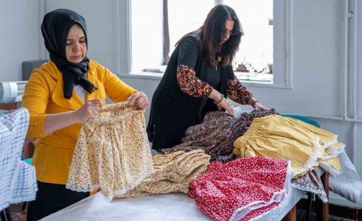 Kız çocukları için bluz ve etek; erkek çocukları için ise gömlek ve şorttan oluşan bayramlık kıyafetler, atölyelerde 30 usta öğreticinin maharetli ellerinde hazırlandı. Bluz, etek, şort ve gömlek olmak üzere her birinden 100’er adet dikilen bayramlık kıyafetlerin yanında 100 adet örme oyuncak da deprem bölgesine gönderilmek üzere özenle paketlendi.