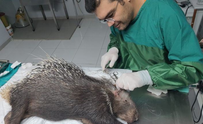 Muğla’nın Fethiye ilçesinde yaralı halde bulunan oklu kirpi, ilçedeki veterinerde tedavi altına alındı.
