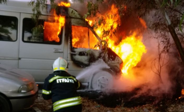 Muğla’nın Milas ilçesinde park halindeki minibüste çıkan yangın itfaiye ekipleri tarafından söndürülürken araç küle döndü.