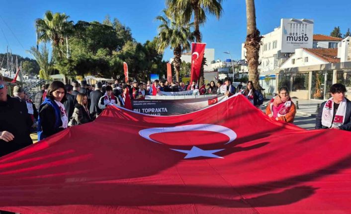 Marina’dan başlayan yürüyüş, Bodrum Belediye Meydanı’nda son buldu. Yürüyüşte öğrenciler tarafından 120 metre uzunluğunda Türk Bayrağı taşındı.