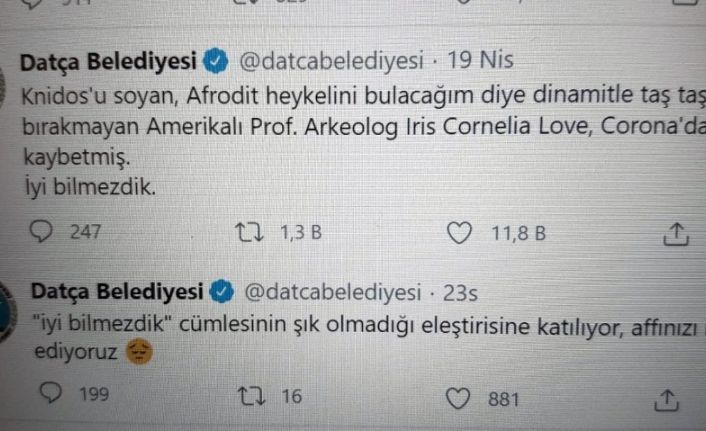 Muğla bölgesinde sosyal medyayı en iyi kullanan Belediyelerin başında gelen Datça Belediyesi, Arkeolog Iris Cornelia Love’un ölümü sonrası “Knidos’u soyan, Afrodit heykelini bulacağım diye dinamitle taş taş üstünde bırakmayan Amerikalı Prof. Arkeolog Iris Cornelia Love, Corona’dan hayatını kaybetmiş. İyi bilmezdik” mesajı yayımladı.