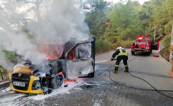 Anmutalan Mahallesi Sarıca yolunda seyir halinde olan ticari taksinin motor bölümünden aniden dumanlar yükselmeye başladı. İçinde yolcu bulunmadığı öğrenilen ticari taksinin yanması sonucu 112 Acil Çağrı Merkezine ihbar yapılması sonrası Büyükşehir Belediyesi Marmaris İtfaiye Grup Amirliği ekipleri sevk edildi.